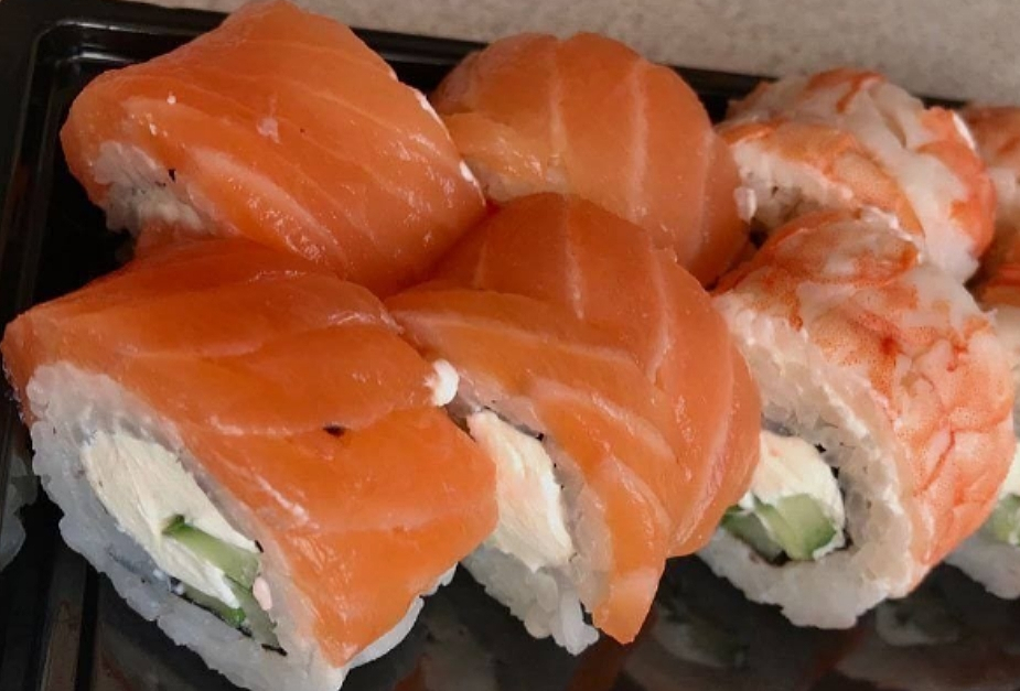 Сыр сливочный, лосось, креветка, огурец, майонез, соус унаги, масаго