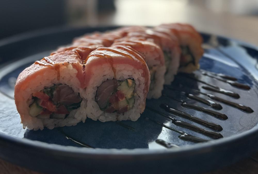 Лист нори, рис, лосось, огурец, творожный сыр, стружка тунца.