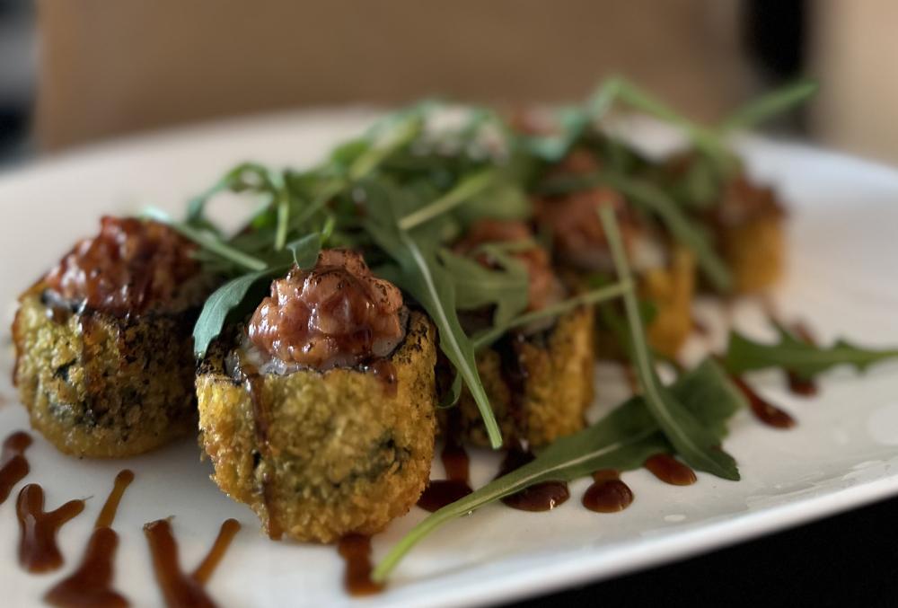 Нори, рис, творожный сыр, , лосось и руккола , соус спайс