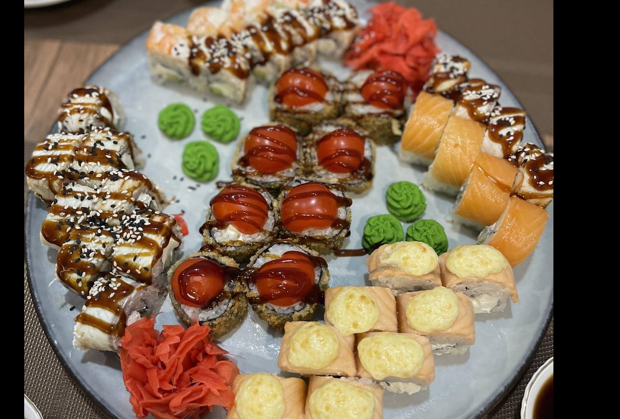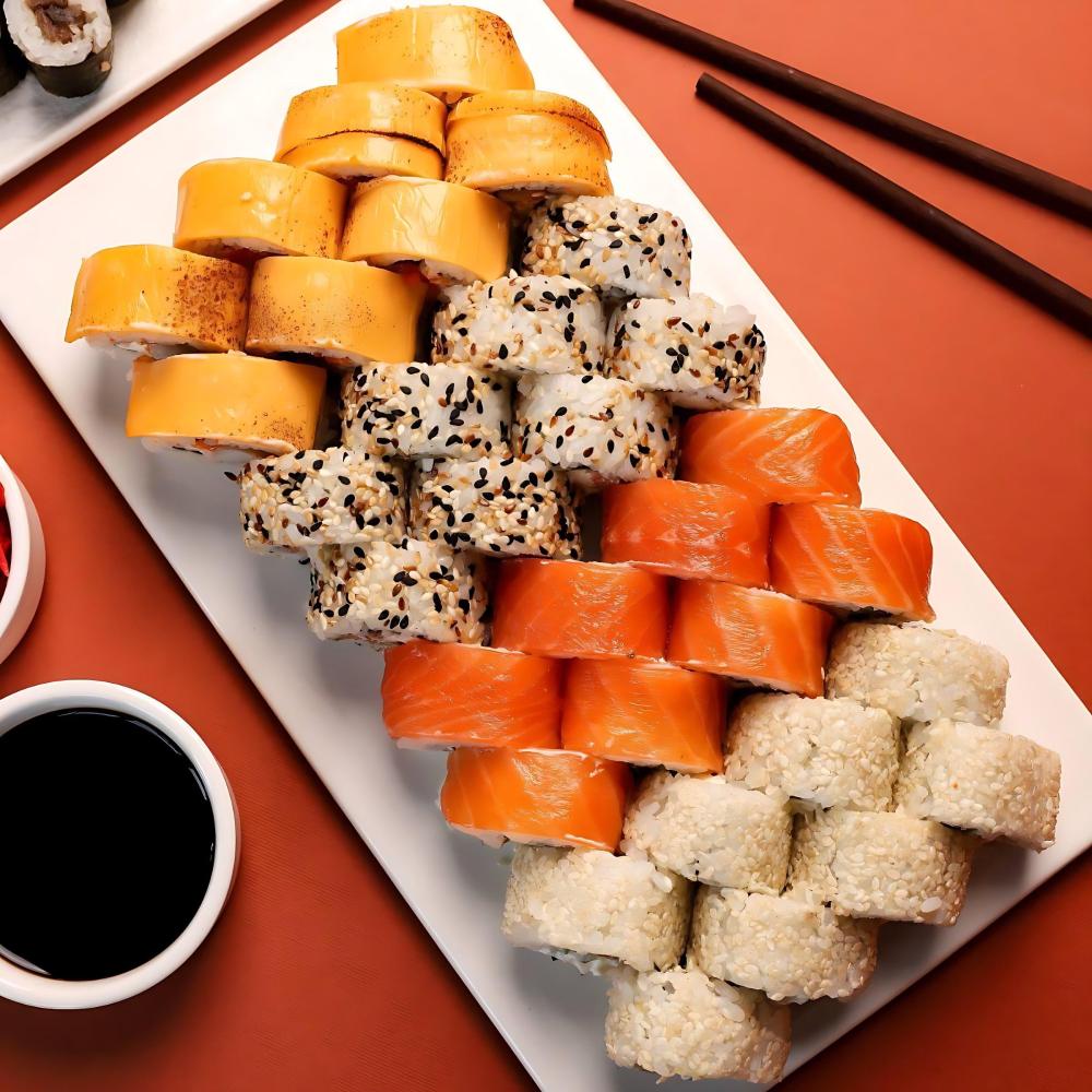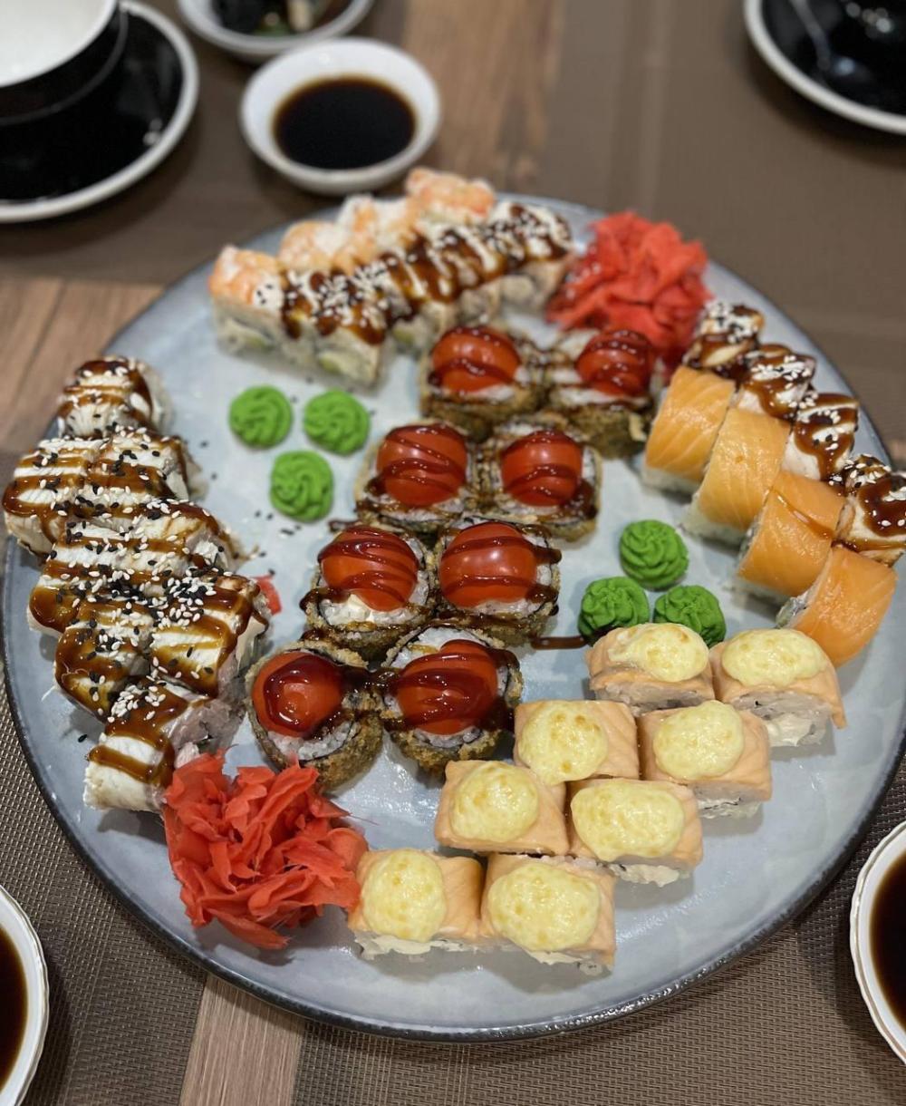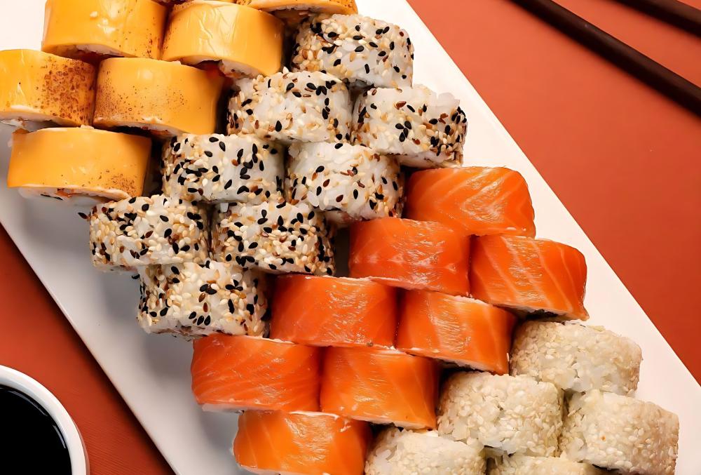 Цезарь ролл, филадельфия лайт, жаренный с лососем, грин ролл, гейша, чеддр и лосось