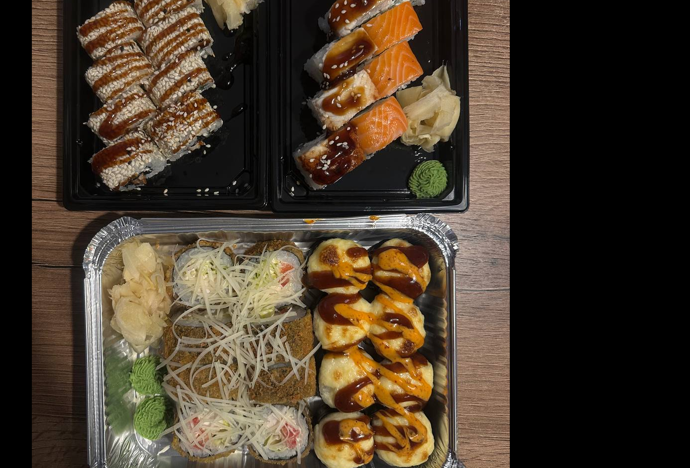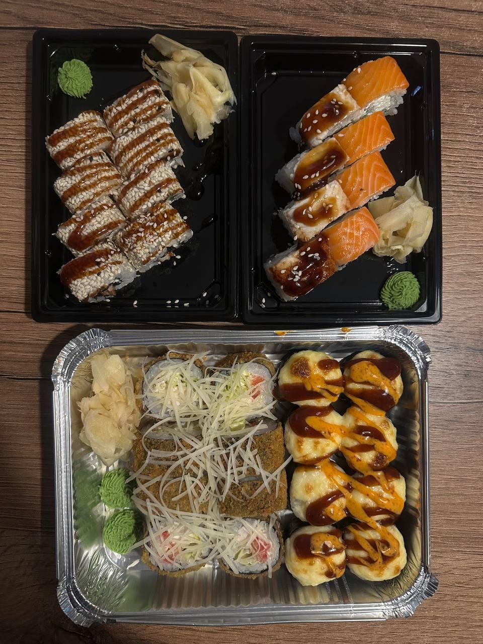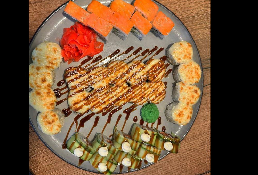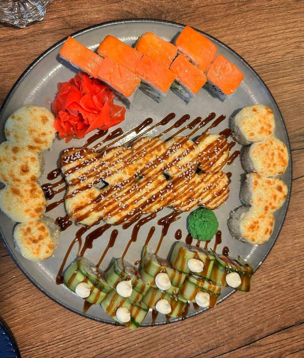Цезарь ролл, филадельфия лайт, жаренный с лососем, грин ролл, гейша, чеддр и лосось